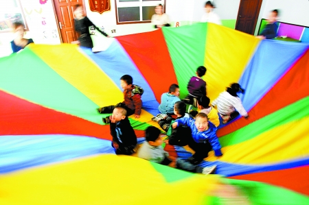 昨天上午10時(shí)許,記者來到鄭州康達(dá)能力訓(xùn)練中心,未走進(jìn)教室,已聽到孩子們“嘰嘰喳喳”的叫聲。在其中一教室中看到,100多個(gè)可愛的孩子正在進(jìn)行康復(fù)訓(xùn)練,有的在老師及家長配合下做模式操,有的正在做親子游戲。
