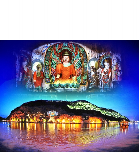 夜色下的龍門在各色燈光的映照下美輪美奐,萬(wàn)千佛陀現(xiàn)金身。記者 陳曉東 攝 啟天 制圖