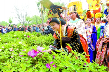將軍護(hù)駕、宮女旁侍。4月14日,“武則天”居然“穿越”到洛陽中國國花園,游園踏青、觀賞牡丹。原來,這是第30屆中國洛陽牡丹文化節(jié)期間舉行的一場大型藝術(shù)表演。 首席記者 陳曉東 圖