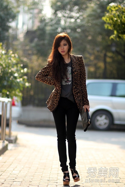 豹紋外套,個性十足。聳肩的版型,西裝的款式,穿在身上很顯氣質(zhì)。內(nèi)搭灰色T恤下穿黑色小腳褲,高跟鞋,優(yōu)雅女人味十足。