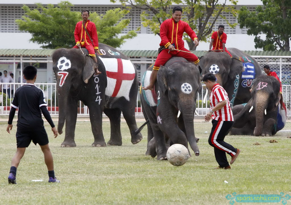 6月9日,學(xué)生們與身上畫有世界杯參賽球隊國旗圖案的大象踢足球。 當(dāng)日,在泰國大城府舉行了一場有大象參與的“世界杯”足球比賽。 新華社/路透
