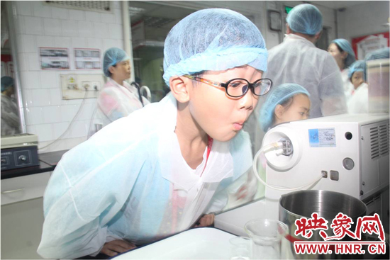 穿上白色的參觀服、戴上一次性帽子,受邀家庭進(jìn)入了檢測(cè)區(qū),參觀了質(zhì)量控制的檢測(cè)工作流程。正在工作的品控員,現(xiàn)場(chǎng)邀請(qǐng)了一名小朋友進(jìn)行了其中一項(xiàng)檢測(cè)--白利度檢測(cè)?!昂?jiǎn)單來(lái)講,就是利用密度儀,測(cè)試一瓶飲料的糖度和含氣量?jī)蓚€(gè)指標(biāo)。”品控員張青介紹道。