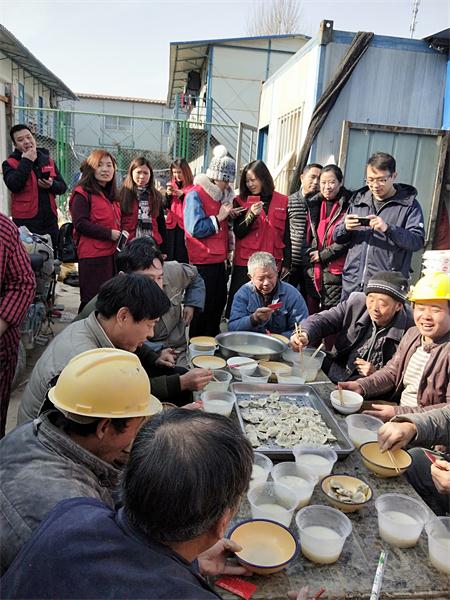 與此同時,第三路名嘴李璇和王澄也在鄭州市北建材附近的工地上行動了起來。他們帶著15名義工來到工地食堂,為民工兄弟們煮起了餃子。餃子出鍋,主持人李璇和王澄和民工兄弟們圍坐在一起,聊著天,品嘗熱騰騰的水餃。在現(xiàn)場,主持人還遇到了一位特殊的老人——劉春娥。劉老太太常年堅持義務(wù)給農(nóng)民工送衣服鞋墊,可以說,鄭州工地上的人都認識這位老太太。今天,劉老太太正巧又給這里的工人們帶了40對新納好的鞋墊兒,前不久,老太太才送來了不少衣物。拿著新鞋墊,吃著熱餃子,民工兄弟們個個笑開了花。