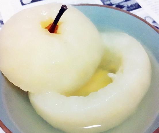 1.雪梨去皮從大頭挖個(gè)洞把果核挖出小心不要把梨子挖穿;