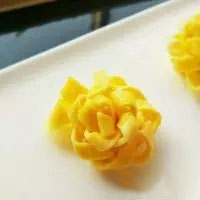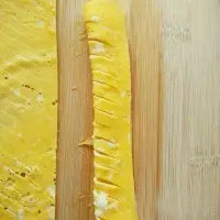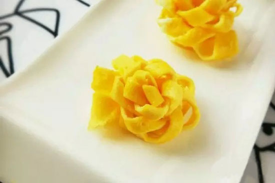 1. 雞蛋打散加少許鹽,淀粉加少許水調(diào)勻,加在蛋液中攪拌均勻,平底鍋小火,倒入蛋液,煎成薄薄的蛋皮,切成寬約4厘米的長條。