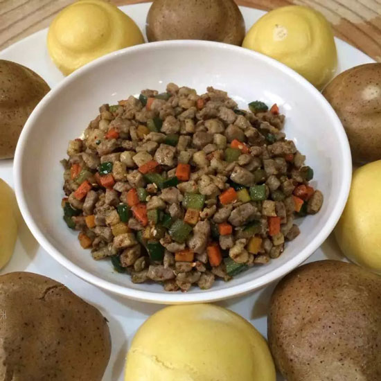 4、鍋中留少許油,蒜蓉炒香,然后倒入滑過(guò)油的肉丁,加入辣椒孜然粉,鹽,味精,雞粉,翻炒均勻就可以出鍋了,再搭配上精致的窩窩頭,相信您一定會(huì)愛(ài)不釋口!