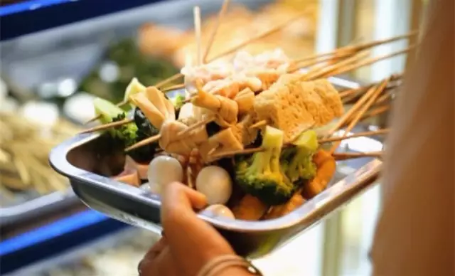 與我們常吃的串串不同,這里的串串居然都是提前煮熟,放涼之后整整齊齊串在竹簽上,吃的時(shí)候在料湯里泡一下就行。