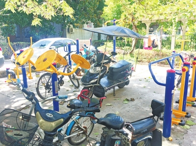 據(jù)王女士透露,近段時間,樓下有很多電動車及自行車把健身器材圍住了,有的電動車上還裝有報警器,也不敢觸碰,一碰警報就響個不停,“我們只好到別的地方鍛煉”。