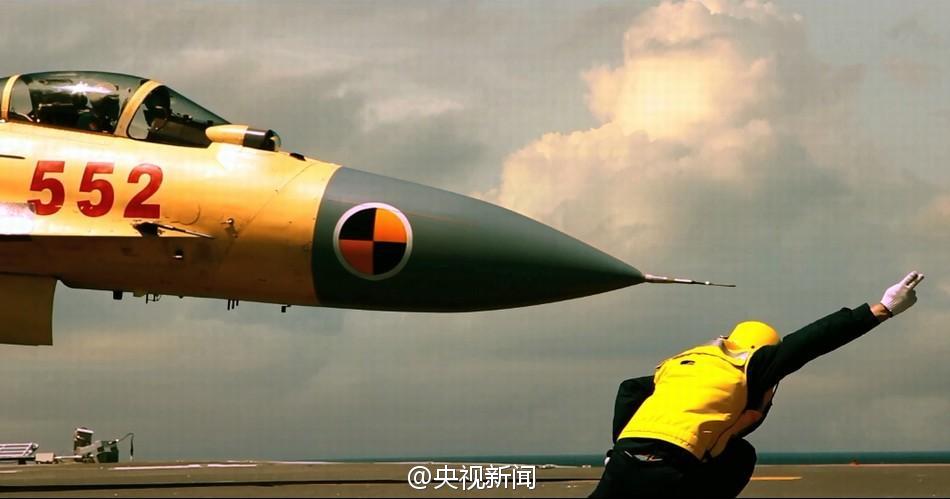 昨天,央視新聞首先在節(jié)目中播出這一視頻。視頻配以恢宏的音樂,記錄了殲15艦載機在遼寧艦上起飛、著艦的畫面。視頻以飛行員的日?;居?xùn)練作為開頭,描述了飛行員做起飛前的準備工作、飛行中駕駛飛機及著陸的狀態(tài)。值得注意的是,視頻中,還有近10秒時間展示了殲15在空中進行特技飛行動作的畫面,飛行員駕駛飛機進行翻轉(zhuǎn),畫面中天空與地面的位置調(diào)轉(zhuǎn)。