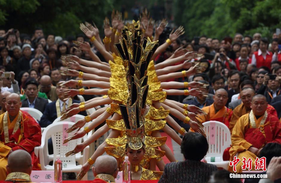 4月28日,演員在金陵禮佛月開幕式上表演節(jié)目《千手觀音》。當(dāng)日,南京靈谷寺開山1500周年慶典暨第四屆金陵禮佛文化月開幕式在紫金山靈谷寺公園無梁殿前舉行。據(jù)悉,禮佛文化月期間還將舉行佛頂骨舍利的恭請法會、諸圣舍利迎請法會、講經(jīng)說法、南京國際佛事用品展覽會等系列活動(dòng)。中新社發(fā) 泱波 攝
