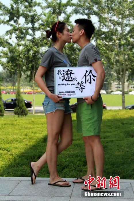 6月23日,情侶拿著“我在遼大等你!的牌子在拍照。當(dāng)日,遼寧大學(xué)攝影協(xié)會(huì)推出一組遼大創(chuàng)意“招生名片”的圖片,數(shù)位帥哥靚妹抓人眼球。中新社發(fā) 于海洋 攝