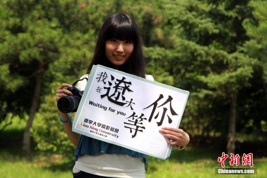 6月23日,美女拿著“我在遼大等你!的牌子在拍照片。當(dāng)日, 遼寧大學(xué)攝影協(xié)會(huì)推出一組遼大創(chuàng)意“招生名片”照片,數(shù)位帥哥靚妹更是抓人眼球。中新社發(fā) 于海洋 攝
