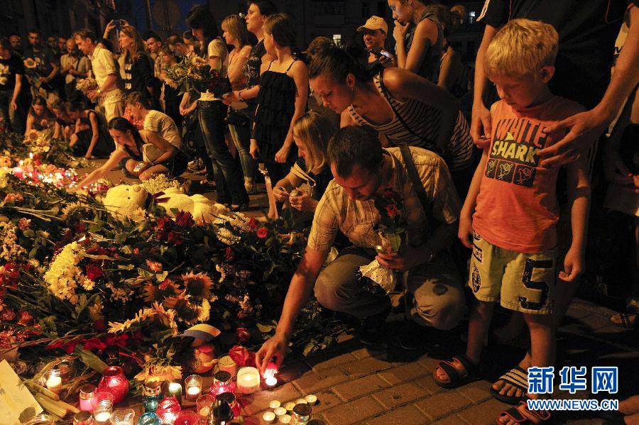 7月17日,在烏克蘭首都基輔,人們來到荷蘭大使館向失事馬航MH17航班遇難人員表示悼念。馬來西亞航空公司一架載有295人的波音777客機17日在靠近俄羅斯邊界的烏克蘭東部地區(qū)墜毀。 新華社/路透