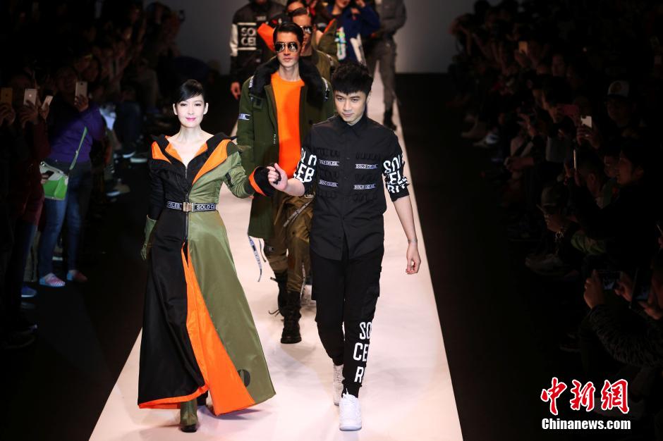 4月13日晚,變身設(shè)計(jì)師的古巨基個(gè)人第一場時(shí)裝發(fā)布會(huì)在上海時(shí)裝周舉行。為支持好友首秀,女神周慧敏特意飛到上海,親自登臺(tái)走秀,驚艷全場。圖為古巨基與周慧敏共同登臺(tái)。 張亨偉 攝