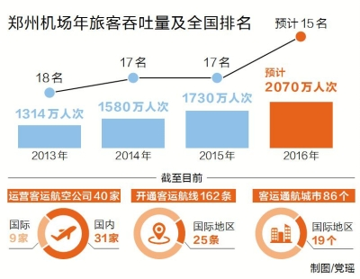 據(jù)鄭州機場相關(guān)負責(zé)人介紹,2014年鄭州機場旅客吞吐量突破1580萬人次,同比增長20%,增速位居全國20個大型機場首位。