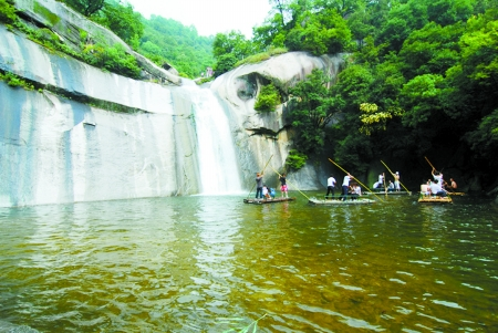 龍?zhí)稖仙角逅悖嫜码U(xiǎn),頗具登臨之趣。整個(gè)峽谷兩側(cè)是花崗巖山體,一色的蒼青如黛,更顯巨石秀姿。大龍?zhí)陡浇囊粔K巨石酷似鱷魚(yú)頭,正伸入水中飲水,游人稱(chēng)之為“鱷魚(yú)戲水”;“四連瀑”附近有塊巨石更是神奇,從對(duì)面山頭看,猶如豬八戒的頭,像是伸出水面偷看龍女洗澡,人們稱(chēng)之為“八戒窺浴”;從后面看又酷似船頭,因此又叫“船石”;黑龍?zhí)杜赃呌腥龡l極像鯊魚(yú)的巨石,魚(yú)頭伸向潭水,美其名曰“三鯊鬧龍?zhí)丁?。此外,還有“絕壁掛雪”、“神龜過(guò)江”、“鯉魚(yú)跳龍門(mén)”等。奇石遍布,形態(tài)各異,惟妙惟肖,渾然天成。